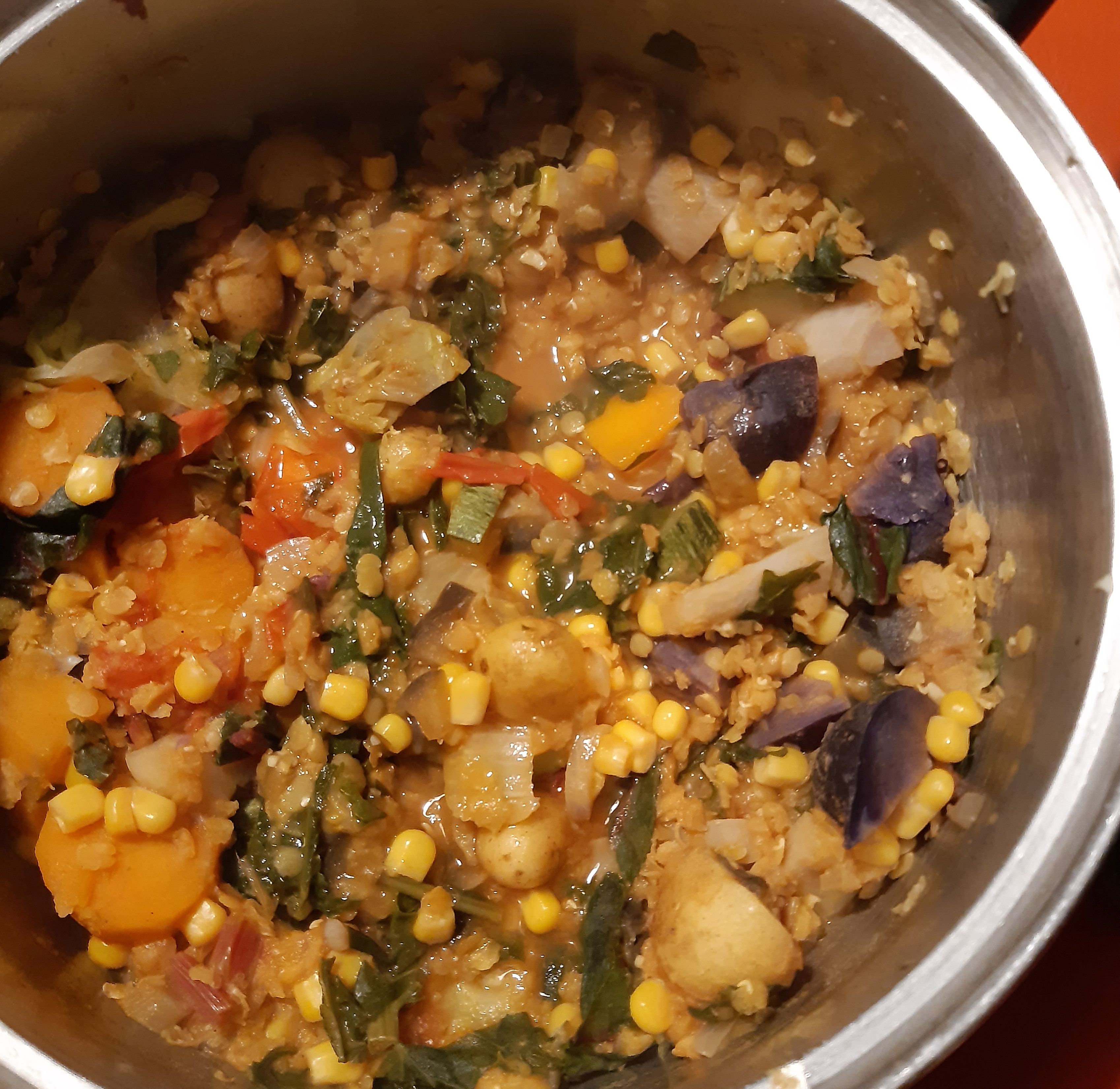 - Add sweet potato, garlic, chopped potatoes (white and purple if you have), tomatoes, courgette, some shredded kale. Cook with a lid on, make sure there is enough water but not too much.