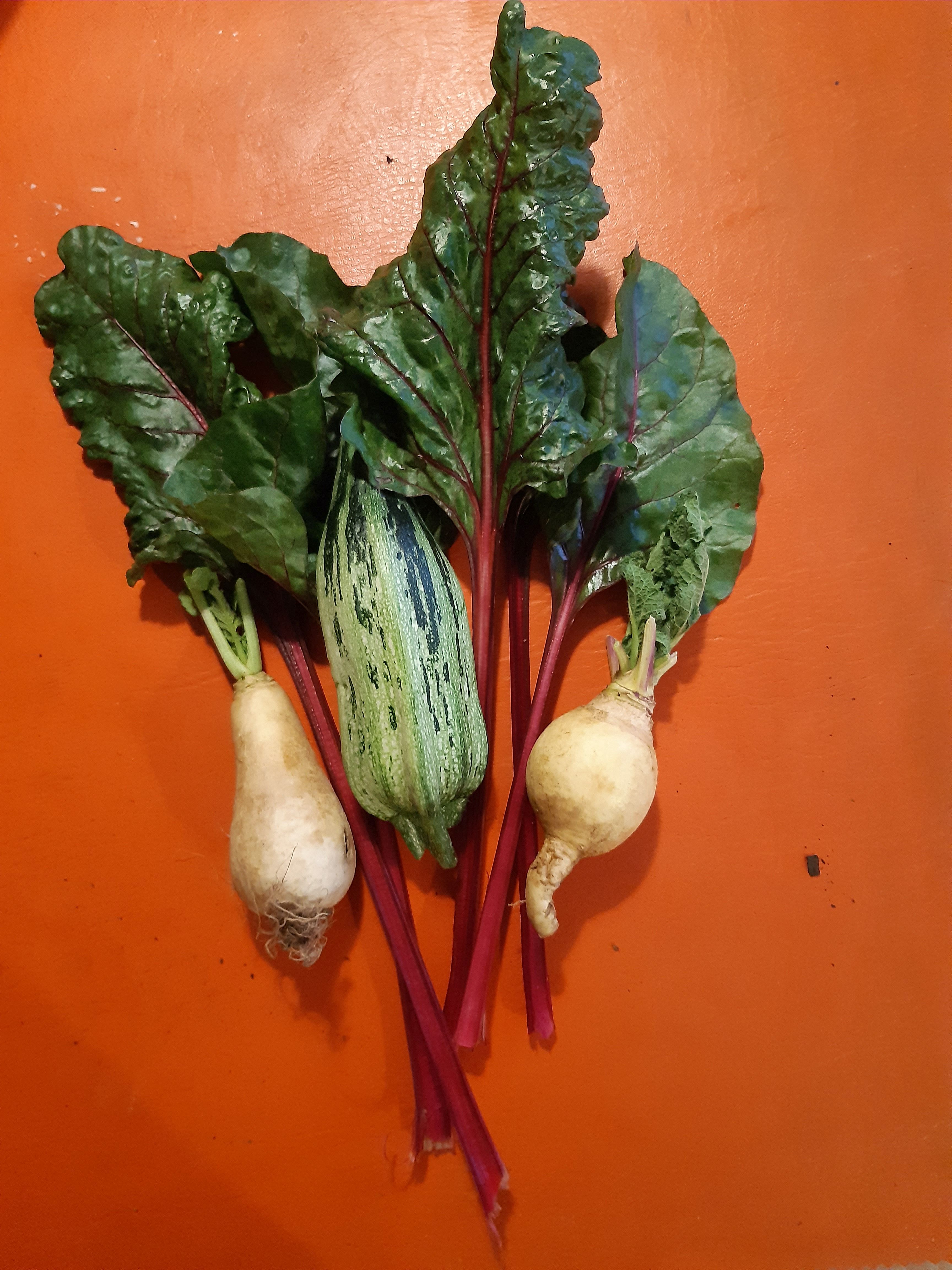 - but adding: washed quinoa, turnips, garlic, beans, chard, courgette.