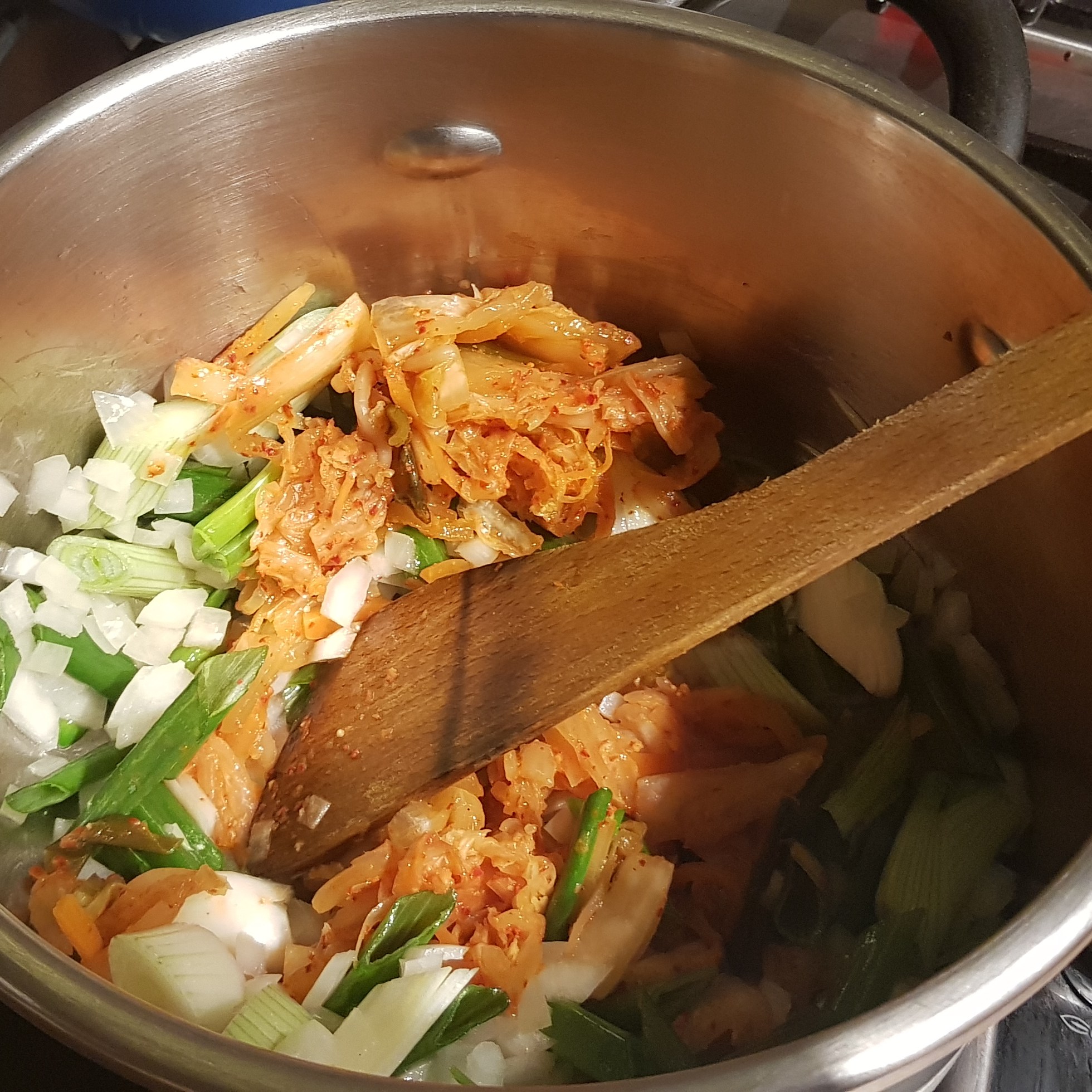 Heat the sesame oil and add the chopped onion. Fry for a few minutes until the onion starts to go transparent, then add the kimchi, spring onion. Stir and cook until for another few minutes to heat through then add the gochujang, doenjang, and gochugaru. Stir until everything is well combined.