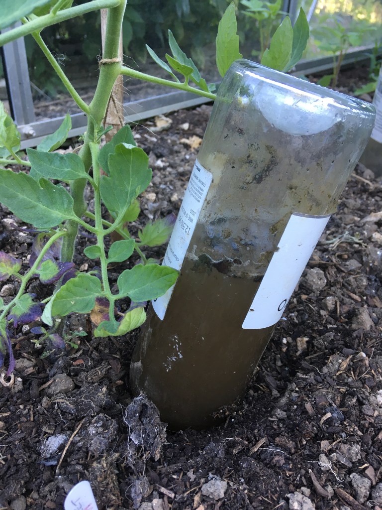 There is also a kind of watering system called an Olla, which is traditionally a terracotta globe that’s buried in the soil and has a narrow neck through which one waters. The water seeps out of the terracotta and the plant may grow its roots around the globe. I tried making an Olla from a terracotta plant pot but I’d sealed the drainage hole. It worked as a way of watering at the root level but unfortunately it caught insects, mainly woodlice but I didn’t like the idea of catching other insects.