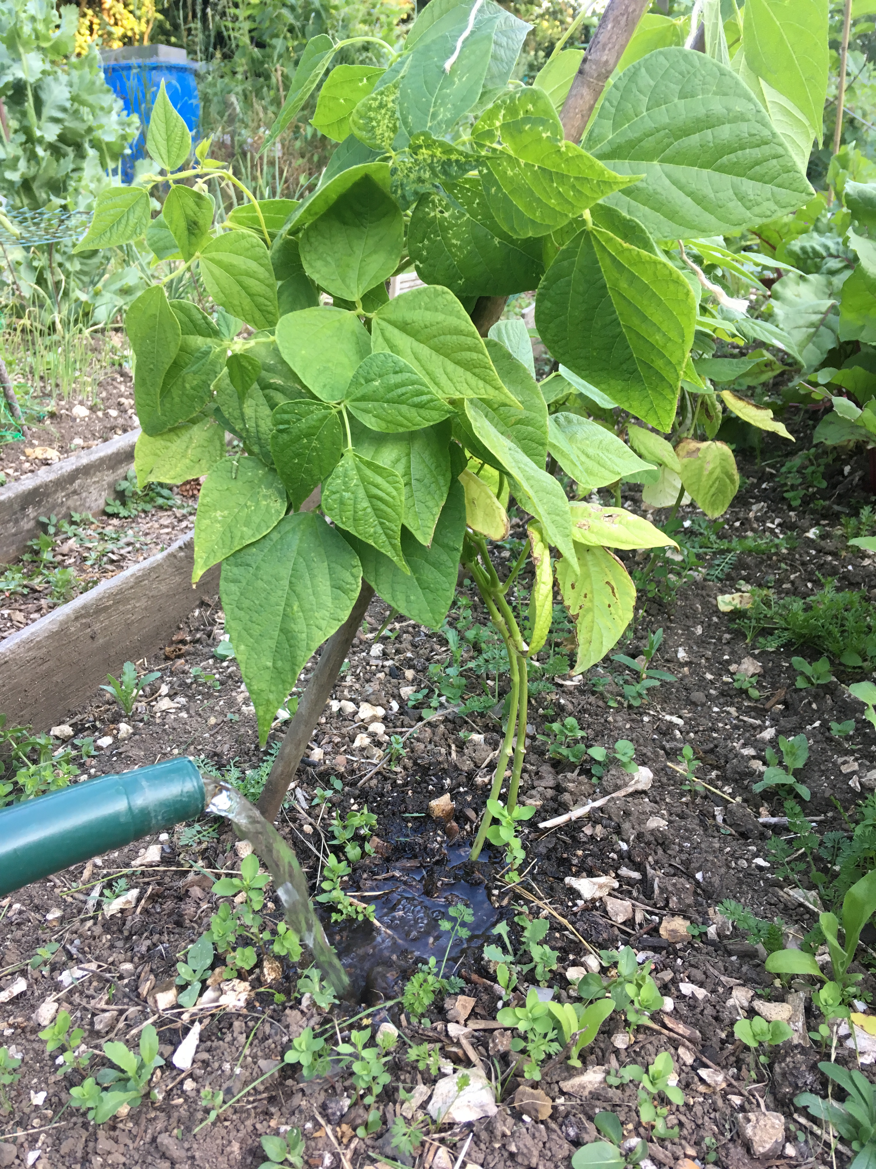 Ideally avoid watering in the strong sunshine. This avoids losing lots of water through evaporation. Avoid spraying a hosepipe all over the place – this wastes water, allows lots of evaporation, plus you are watering weeds! The best way to water is to get the supply as close to the plants roots as possible. I often use plastic bottles with the bottoms cut off as makeshift tubes. I bury the neck down next to the plant, and this means that when I pour water directly into the bottle I know that the supply will reach the roots and won’t be evaporated. Some people use ‘soakhose’, other people fill wine bottles with water and then up end them into the soil but this is tricky when the soil is hard and compacted in dry spells and perhaps works better with potted plants.