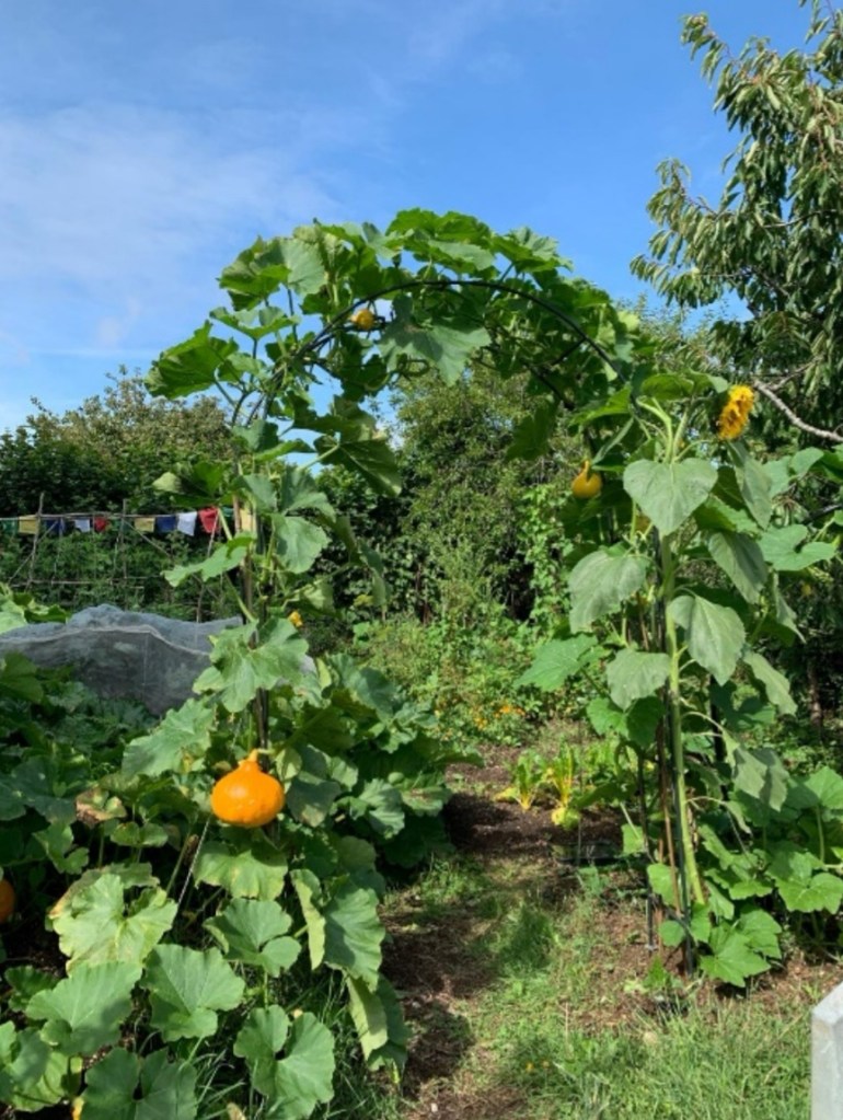 I also tried growing squash over a couple of different structures. I know squash likes to scramble, I’ve even seen it growing up the hazel hedges, and keeping the squash off the ground and in the sunlight is a good thing to aim for. I was lucky enough to find a rose arch in the ‘middle of Lidl’, and also tried re-purposing some plumbers’ piping I’d used previously to build hoops for netting over my brassicas. It works really well pushed over bamboo sticks stuck into the ground.
